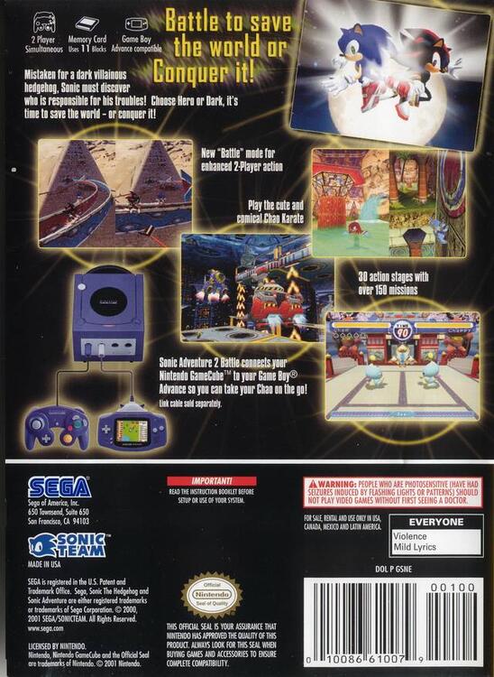 Coloré et toujours plus vif, c'est dans Sonic Adventure 2 Battle qu'apparaît pour la première fois Shadow, le hérisson noir. Hero ou Dark, faites évoluer votre équipe composée de trois personnages vers son but respectif.