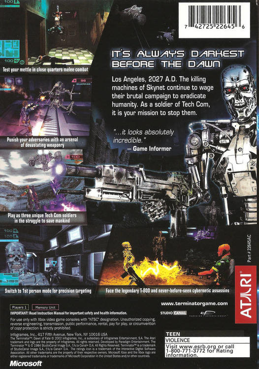 Skynet's machines have risen, reaping a bloody harvest of human flesh across the world. You are a soldier of Tech Com - a ragged team of human resistance fighters determined to stop the cyber onslaught in postapocalyptic Los Angeles. The movie prequel The Terminator lets you play as three characters - each with specialized skills and abilities. Your ultimate goal is to travel back in time to 1984, hoping to stop a relentless Terminator T-800 model from assassinating Sarah Connor - the mother of resistance leader John Connor. Armies of cyborgs stand in your way, but you'll have plenty of new weapons and melee moves to fight your way through.