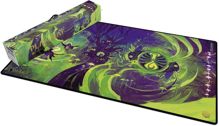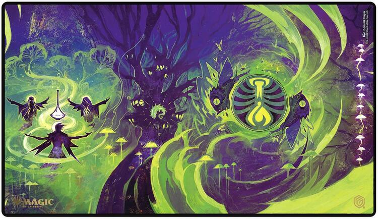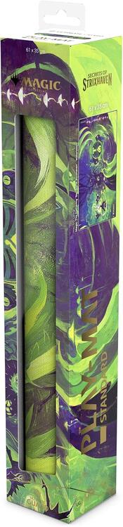 The top side of the playmat is printed with officially licensed artwork from Magic: The Gathering, the upcoming "Secrets of Strixhaven" set.