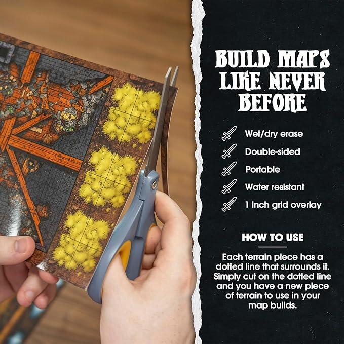 Las piezas de juego de Dungeon Craft son versátiles. Casi todas las piezas de juego, incluidos edificios, salas de mazmorras, pasillos con trampas y piezas de la naturaleza, son reversibles.