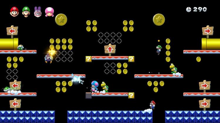 Mario, Luigi y Toad están presentes, pero también se unen Toadette y Carottin. Este último no recibe daño al tocar enemigos, por lo que es un personaje ideal para quienes encuentran que la acción del juego es un gran desafío, y si Toadette toma una super corona, ¡se transforma en Peachette!