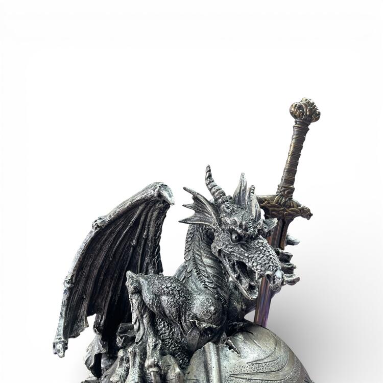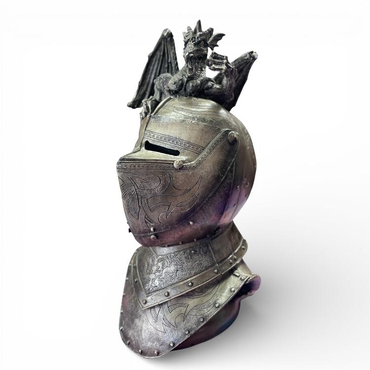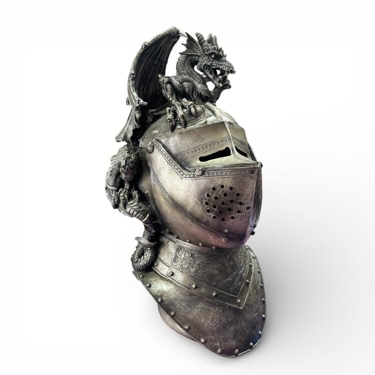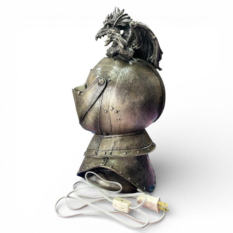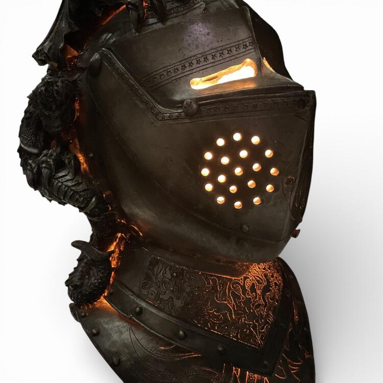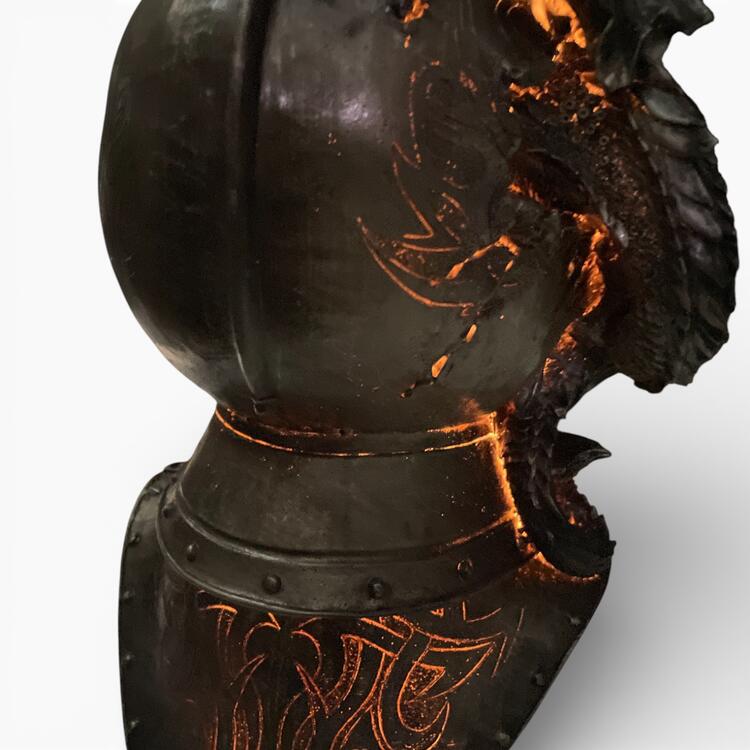 Breng een vleugje tijdloze middeleeuwse fantasie in uw interieur met deze decoratieve helm- en draaklamp. Met een draak die in de helm is verwerkt en een licht dat door de lamp schijnt en opmerkelijke patronen toont, geniet u van een rustgevend licht en een boeiend beeldje.